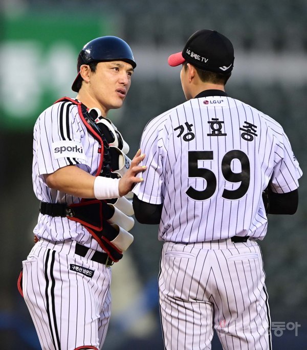 18일 서울 잠실야구장에서 열린 ‘2023 신한은행 SOL KBO리그’ LG 트윈스와 NC 다이노스의 경기에서 2회초 2사 2루 상황에서 LG 포수 박동원이 투수와 이야기를 하고 있다.