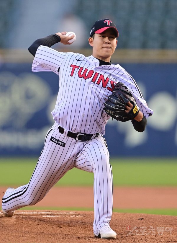 18일 서울 잠실야구장에서 열린 ‘2023 신한은행 SOL KBO리그’ LG 트윈스와 NC 다이노스의 경기에서 선발 투수로 마운드에 오른 LG 강효종이 역투하고 있다.