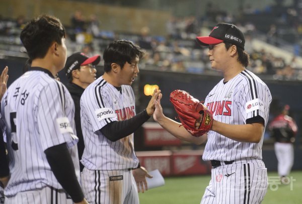 18일 서울 잠실야구장에서 열린 ‘2023 신한은행 SOL KBO리그’ LG 트윈스와 NC 다이노스의 경기에서 9회초 수비를 마친 LG 고우석이 동료들과 하이파이브를 하고 있다.