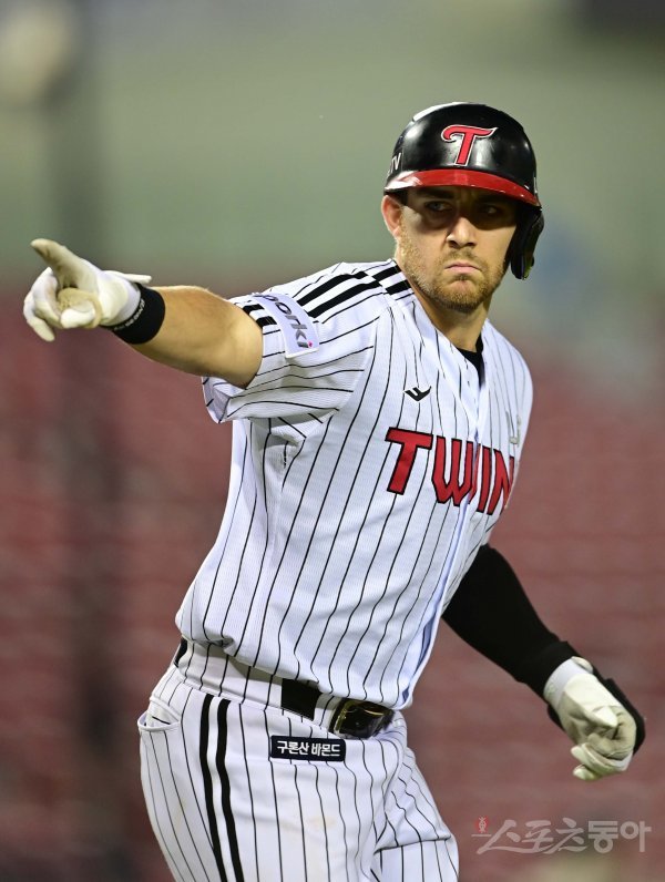 18일 서울 잠실야구장에서 열린 ‘2023 신한은행 SOL KBO리그’ LG 트윈스와 NC 다이노스의 경기에서 8회말 1사 2루 LG 오스틴이 동점 좌월 투런 홈런을 친 후 더그아웃을 향해 손짓하고 있다.