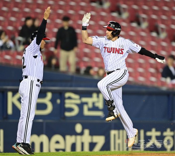 18일 서울 잠실야구장에서 열린 ‘2023 신한은행 SOL KBO리그’ LG 트윈스와 NC 다이노스의 경기에서 8회말 1사 2루 LG 오스틴이 동점 좌월 투런 홈런을 친 후 3루코치와 기쁨을 나누고 있다.