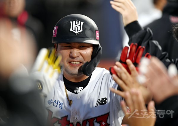 19일 경기도 수원 kt위즈파크에서 ‘2023 신한은행 SOL KBO리그’ kt 위즈와 SSG 랜더스의 경기가 열렸다. 3회말 2사 1, 2루에서 적시타 때 득점을 올린 김상수가 동료들의 환영을 받고 있다.