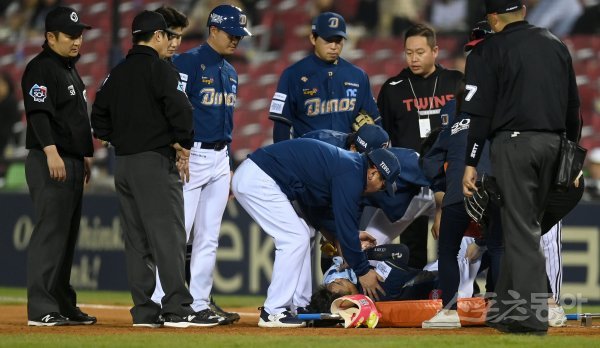 19일 서울 잠실야구장에서 ‘2023 신한은행 SOL KBO리그’ NC 다이노스와 LG 트윈스 경기가 열렸다. 4회초 1사 1,3루 NC 박석민이 내야 땅볼을 치고 1루에서 아웃되는 과정에서 부상을 당해 넘어져 있다.