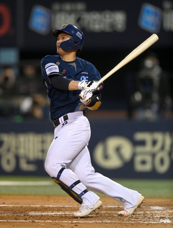 19일 서울 잠실야구장에서 ‘2023 신한은행 SOL KBO리그’ NC 다이노스와 LG 트윈스 경기가 열렸다. 3회초 2사 1,2루 NC 안중열이 1타점 좌전 안타를 치고 있다.