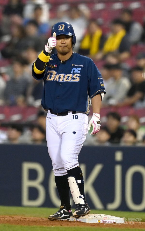 19일 서울 잠실야구장에서 ‘2023 신한은행 SOL KBO리그’ NC 다이노스와 LG 트윈스 경기가 열렸다. 3회초 무사 1,3루 NC 박석민이 1타점 적시타를 치고 1루에서 기뻐하고 있다.