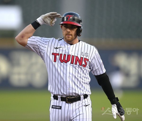 19일 서울 잠실야구장에서 ‘2023 신한은행 SOL KBO리그’ NC 다이노스와 LG 트윈스 경기가 열렸다. 1회말 2사 2루 LG 오스틴이 동점 적시타를 치고 1루에서 기뻐하고 있다.