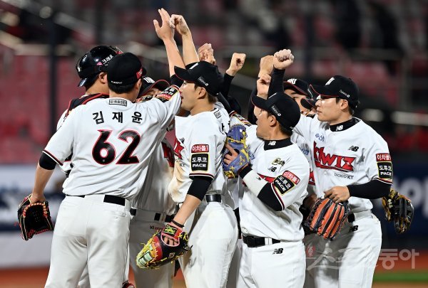 19일 경기도 수원 kt위즈파크에서 ‘2023 신한은행 SOL KBO리그’ kt 위즈와 SSG 랜더스의 경기가 열렸다. kt가 SSG를 상대로 5-2로 승리한 후 선수들이 그라운드에서 기쁨을 나누고 있다.