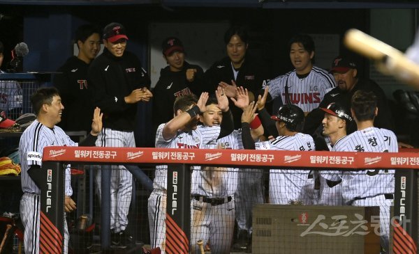 19일 서울 잠실야구장에서 ‘2023 신한은행 SOL KBO리그’ NC 다이노스와 LG 트윈스 경기가 열렸다. 7회말 1사 3루 LG 내야 땅볼 때 득점한 3루주자 문보경이 하이파이브 하고 있다.