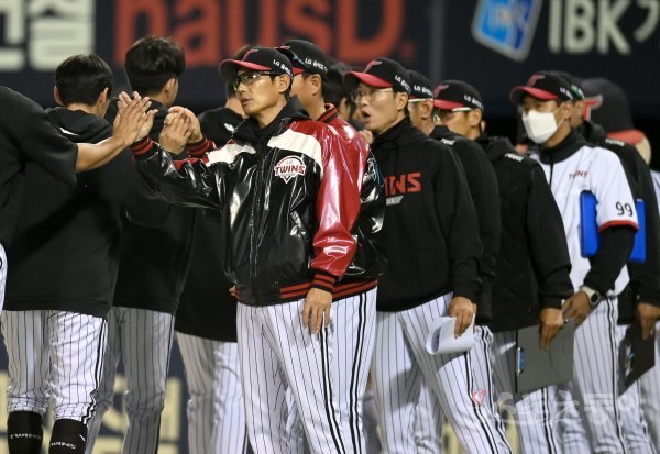 19일 서울 잠실야구장에서 ‘2023 신한은행 SOL KBO리그’ NC 다이노스와 LG 트윈스 경기가 열렸다. 7-5 역전승을 거두며 2연패에서 탈춮한 후 LG 염경엽 감독이 선수들과 하이파이브 하고 있다.