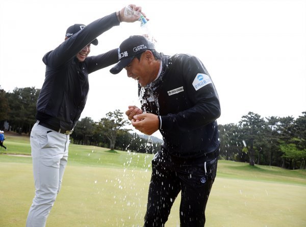 한국프로골프(KPGA) 코리안투어에서 10년만에 아마추어 우승이라는 값진 기록을 쓴 조우영이 동료들로 부터 우승 축하 물세례를 받고 있다. 사진제공 | KLPGA