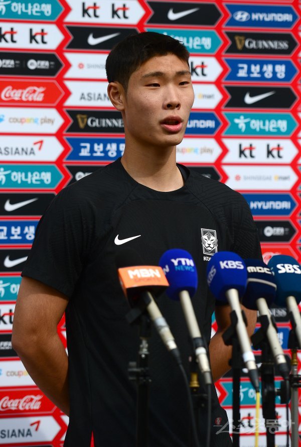 2023 국제축구연맹(FIFA) 아르헨티나 20세 이하(U-20) 월드컵 출전을 앞둔 U-20 축구대표팀이 24일 파주 국가대표트레이닝센터(NFC)에서 소집 훈련을 가졌다. 훈련 전 이영준이 인터뷰를 하고 있다.