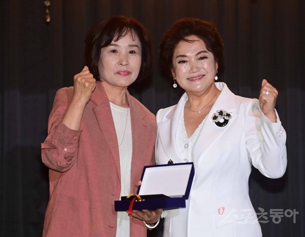 25일 서울 서초구 잠원동 리버사이드호텔에서 열린 ‘명인학원 창립 20주년’ 기념식에서 이채연 대표가 창립 기념상을 수상한 후 최은진 이사와 기념 촬영을 하고 있다.