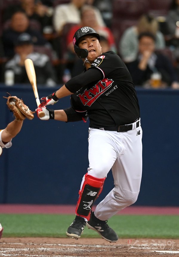 25일 서울 고척스카이돔에서 ‘2023 신한은행 SOL KBO리그’ KT 위즈와 키움 히어로즈 경기가 열렸다. 4회초 무사 KT 강백호가 헛스윙을 하고 있다.
