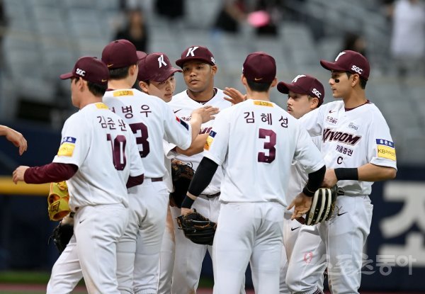 25일 서울 고척스카이돔에서 ‘2023 신한은행 SOL KBO리그’ KT 위즈와 키움 히어로즈 경기가 열렸다. 1-0 승리를 거두며 3연패에서 탈출한 키움 선수들이 하이파이브 하고 있다.