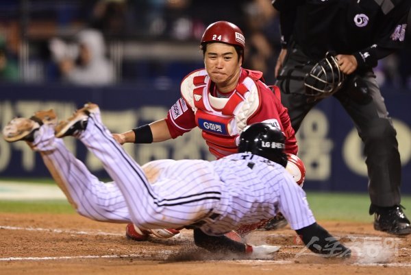 25일 서울 잠실야구장에서 열린 ‘2023 신한은행 SOL KBO리그’ LG 트윈스와 SSG 랜더스의 경기에서 7회말 1사 1, 3루 LG의 내야 땅볼 때 SSG 김민식이 3루주자를 태그 아웃시키고 있다.
