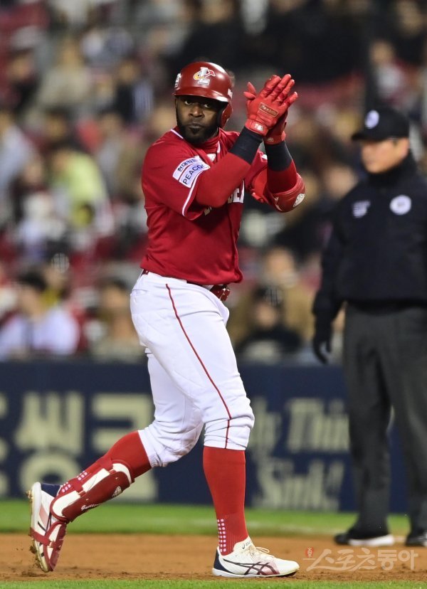 26일 서울 잠실야구장에서 열린 ‘2023 신한은행 SOL KBO리그’ LG 트윈스와 SSG 랜더스의 경기에서 5회초 무사 만루 SSG 에레디아가 동점 2타점 중전 적시타를 친 후 손뼉을 치고 있다.