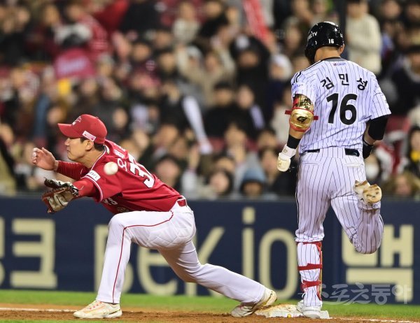26일 서울 잠실야구장에서 열린 ‘2023 신한은행 SOL KBO리그’ LG 트윈스와 SSG 랜더스의 경기에서 3회말 2사 LG의 내야 땅볼 때 SSG 3루수의 송구 실책으로 1루수 오태곤이 볼을 놓치고 있다.