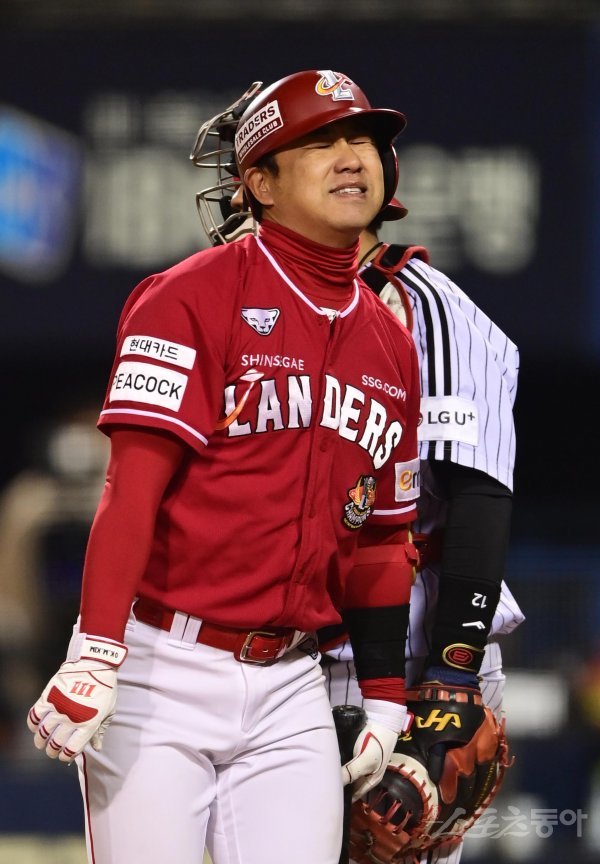 26일 서울 잠실야구장에서 열린 ‘2023 신한은행 SOL KBO리그’ LG 트윈스와 SSG 랜더스의 경기에서 5회초 무사 1, 2루 SSG 김강민이 삼진 아웃을 당한 후 아쉬워하고 있다.