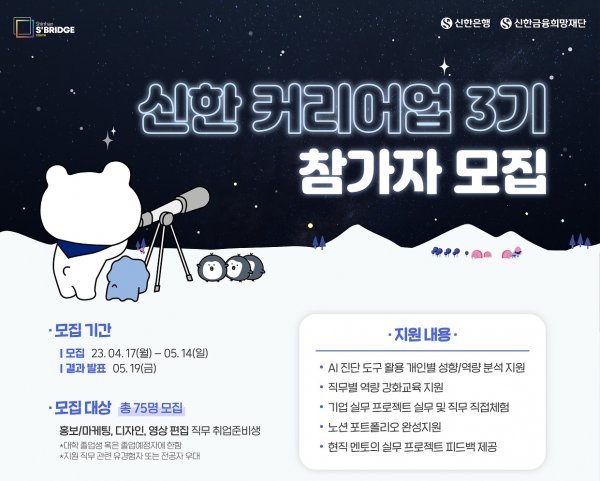 신한은행이 5월 14일까지 ‘신한 커리어업 3기’를 모집한다. 청년구직자의 취업 경쟁력 향상을 위한 교육, 현장실습, 잡매칭을 통해 실질적인 취업 성공을 지원한다. 홍보·마케팅, 디자인, 영상 편집 직무에 청년 구직자 75명을 선발한다. 실시간 온라인 교육을 통해 인공지능(AI) 진단기반 자기이해, 현직자 멘토링, 직무·취업역량교육, 자기PR자료 제작 등 ‘직무확신 프로그램’ 과정을 제공한다.