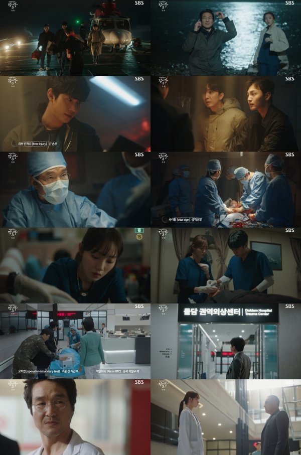 이날 방송은 탈북 총상 환자를 살리기 위해 헬기를 타고 해경 함정에 도착한 서우진(안효섭 분)-박은탁(김민재 분)-정인수(윤나무 분)의 모습으로 시작됐다. 환자는 출혈이 심한 상태로, 헬기 이송 시간도 버티지 못할 만큼 위중했다. 열악한 환경 속 서우진은 휴가 중인 김사부에게 지원 요청을 한 후 응급 처치를 시작했다.