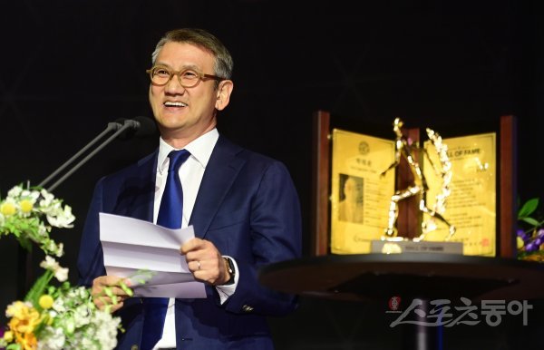 2일 서울 중구 장충동 앰배서더 서울풀만호텔에서 열린 ‘K리그 명예의 전당’ 헌액식에서 공헌자 부문 헌액을 수상한 고 박태준을 대신해 아들 박성빈이 소감을 말하고 있다.
