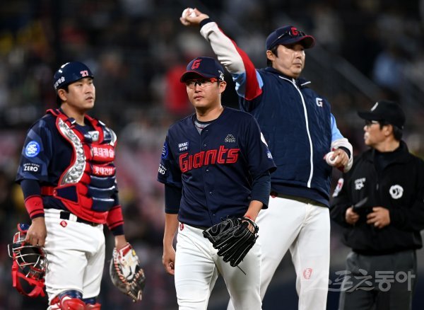 2일 광주 KIA챔피언스필드에서 ‘2023 신한은행 SOL KBO리그’ KIA 타이거즈와 롯데 자이언츠의 경기가 열렸다. 5회말 2사 1, 2루에서 롯데 선발 박세웅이 교체되고 있다.