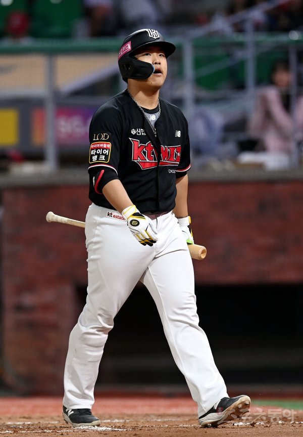 3일 인천 SSG 랜더스필드에서 ‘2023 신한은행 SOL KBO리그’ SSG 랜더스와 kt 위즈의 경기가 열렸다. 6회초 무사 1, 2루에서 kt 대타 강백호가 삼진으로 물러나고 있다.