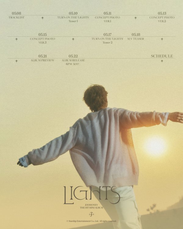주헌은 4일 오후 몬스타엑스 공식 SNS에 자신의 첫 번째 미니 앨범이자 솔로 데뷔 앨범인 ‘라이트(LIGHTS)’ 프로모션 스케줄을 게재했다. 앨범명처럼 따뜻한 태양 빛을 향해 두 팔을 벌린 주헌의 뒷모습이 보는 이들의 감성을 자극했다.