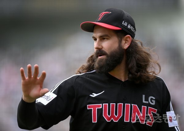 7일 서울 잠실야구장에서 ‘2023 신한은행 SOL KBO리그’ LG트윈스와 두산 베어스 경기가 열렸다. 선발 투수로 등판한 LG 켈리가 6회말 투구를 마치고 하이파이브 하고 있다.