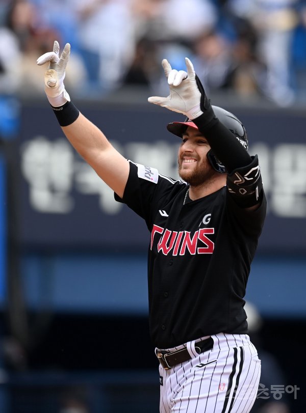 7일 서울 잠실야구장에서 ‘2023 신한은행 SOL KBO리그’ LG트윈스와 두산 베어스 경기가 열렸다. 2회초 2사 1,2루 LG 오스틴이 좌월 스리런 홈런을 날린 후 그라운드를 돌아 홈인해 기뻐하고 있다.