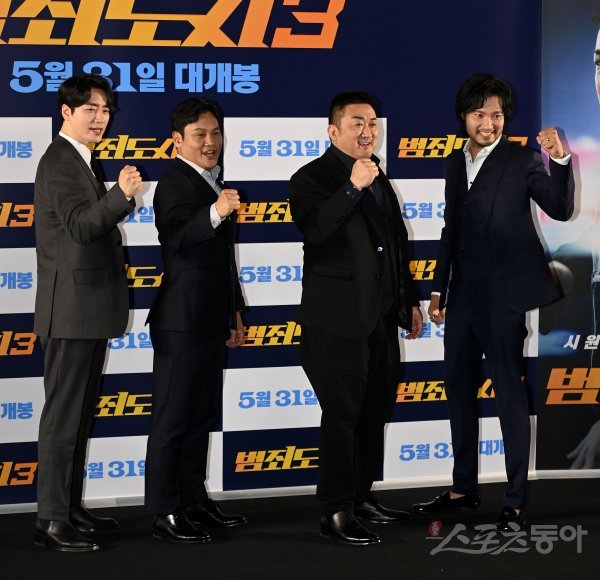 배우 이준혁, 이상용 감독, 마동석, 아오키 무네타카가 서울 강남구 인터컨티넨탈 코엑스에서 열린 ‘범죄도시3’ 제작보고회에서 포토타임을 갖고 있다.
