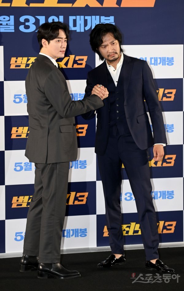 배우 이준혁과 아오키 무네타카가 서울 강남구 인터컨티넨탈 코엑스에서 열린 ‘범죄도시3’ 제작보고회에서 포토타임을 갖고 있다.