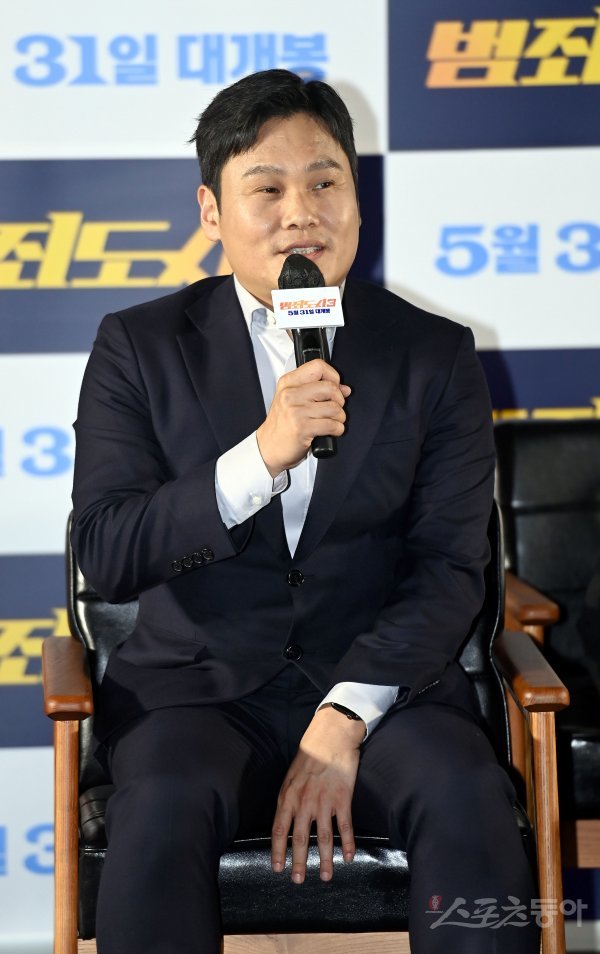 배우 아오키 무네타카가 서울 강남구 인터컨티넨탈 코엑스에서 열린 ‘범죄도시3’ 제작보고회에서 취재진의 질문에 대답하고 있다.
