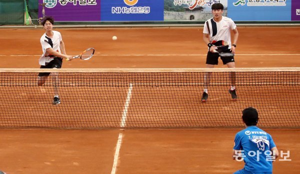 9일 경북 문경국제소프트테니스장에서 열린 ‘제101회 동아일보기 전국소프트테니스대회’ 남자일반부 단체전 결승전 파이널 5복식에 나선 수원시청 김재훈(왼쪽) 윤지환 조가 일본 우치다-우치모토 조를 상대로 스트로크 공격을 하고 있다. 수원시청은 일본대표에게 2-3으로 아깝게 패해 대회 2연패에 실패했다. 문경 l 전영한 동아일보 기자 scoopyjyh@donga.com