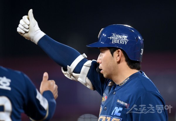 9일 수원KT위즈파크에서 ‘2023 신한은행 SOL KBO리그’ NC 다이노스와 KT 위즈 경기가 열렸다. 5회초 무사 1,2루 NC 오영수가 1타점 우전 안타를 치고 1루에서 기뻐하고 있다.