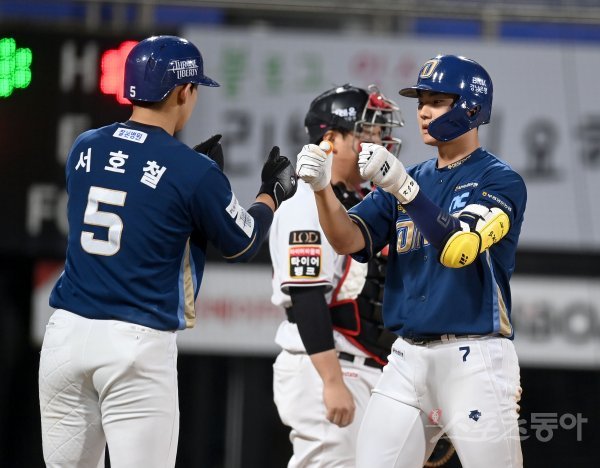 9일 수원KT위즈파크에서 ‘2023 신한은행 SOL KBO리그’ NC 다이노스와 KT 위즈 경기가 열렸다. 6회초 1사 1루 NC 김주원이 좌월 투런 홈런을 날리고 그라운드를 돌아 홈인해 하이파이브 하고 있다.