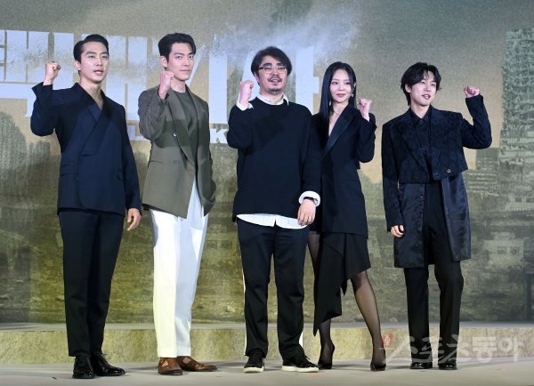 배우 송승헌, 김우빈, 조의석 감독, 이솜, 강유석이 10일 서울 영등포구 프로보크 서울에서 열린 넷플릭스 ‘택배기사’ 제작발표회에서 포토타임을 갖고 있다.