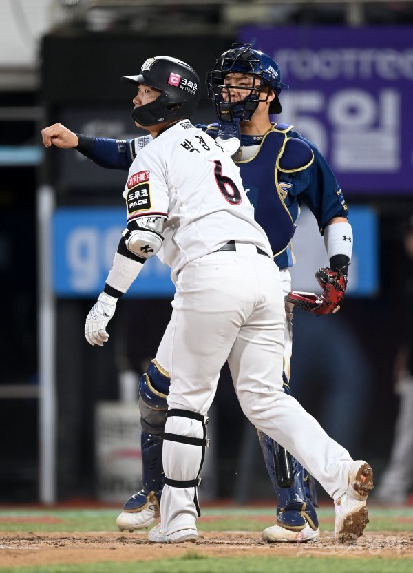 10일 수원KT위즈파크에서 ‘2023 신한은행 SOL KBO리그’ NC 다이노스와 KT 위즈 경기가 열렸다. 4회말 1사 1, 3루 NC 박세혁이 견제 송구 실책을 범하고 있다.