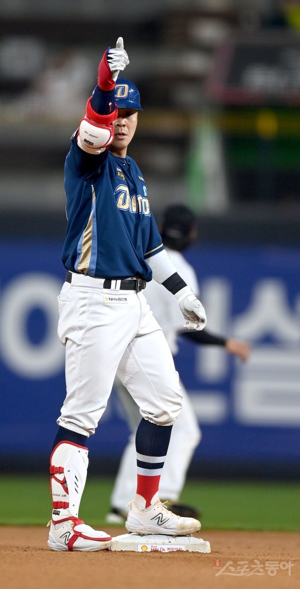 10일 수원KT위즈파크에서 ‘2023 신한은행 SOL KBO리그’ NC 다이노스와 KT 위즈 경기가 열렸다. 8회초 무사 1루 NC 박세혁이 1타점 중전 2루타를 치고 2루에서 기뻐하고 있다.