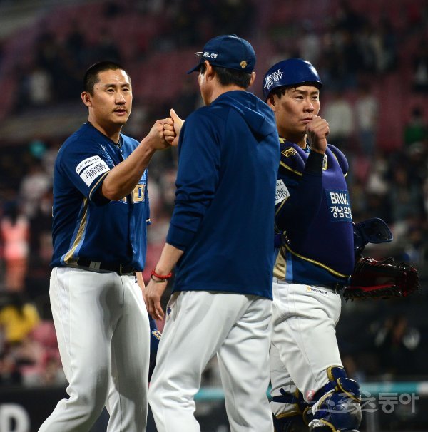 10일 수원KT위즈파크에서 ‘2023 신한은행 SOL KBO리그’ NC 다이노스와 KT 위즈 경기가 열렸다. 9회말 등판해 1이닝을 무실점으로 막으며 세이브를 따낸 NC 이용찬이 하이파이브 하고 있다.