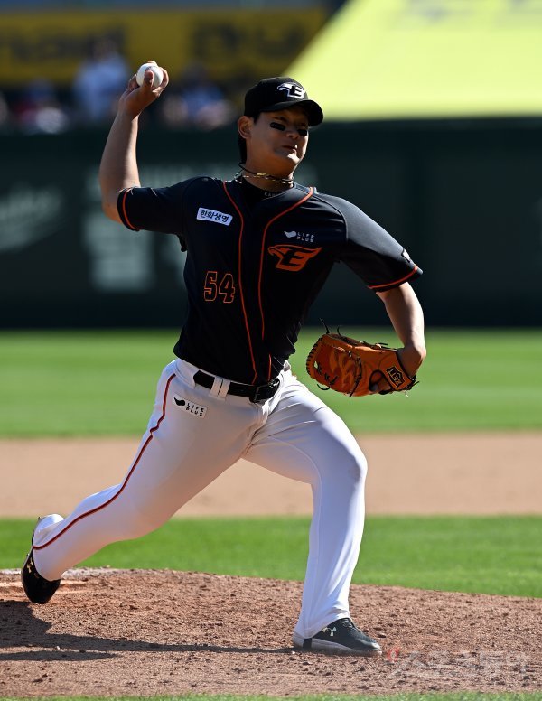 14일 인천 SSG 랜더스필드에서 ‘2023 신한은행 SOL KBO리그’ SSG 랜더스와 한화 이글스의 경기가 열렸다. 7회말 무사에서 한화 김서현이 구원 등판해 볼을 던지고 있다.