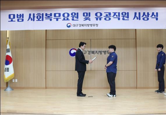 모범 사회복무요원으로 선정돼 표창장을 받고 있는 정대화 사회복무요원. 사진제공 | 대구경북병무청