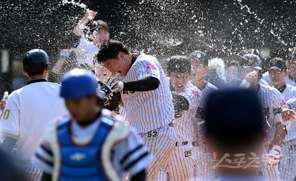 16일 서울 목동야구장에서 ‘제 77회 황금사자기 전국고교야구대회 겸 주말리그 왕중왕전’ 대전제일고와 비봉고의 경기가 열렸다. 9회말 비봉고 백재현이 끝내기 홈런을 쏘아 올린 후 동료들의 물세례를 받고 있다.