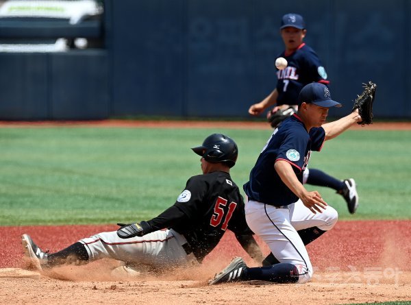 17일 서울 목동야구장에서 ‘제 77회 황금사자기 전국고교야구대회 겸 주말리그 왕중왕전’ 신일고와 선린인터넷고의 경기가 열렸다. 2회말 2사 1루에서 선린인터넷고 1루 주자 이진우가 2루 도루를 성공시키고 있다.