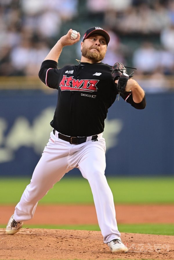 17일 서울 잠실야구장에서 열린 ‘2023 신한은행 SOL KBO리그’ LG 트윈스와 KT 위즈의 경기에서 선발 투수로 마운드에 오른 KT 슐서가 역투하고 있다.