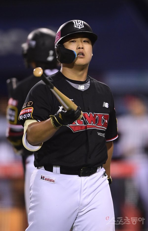 17일 서울 잠실야구장에서 열린 ‘2023 신한은행 SOL KBO리그’ LG 트윈스와 KT 위즈의 경기에서 7회초 무사 KT 강백호가 삼진 아웃을 당한 후 아쉬워하고 있다.