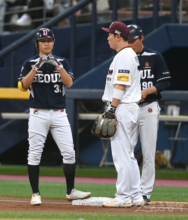 18일 서울 고척스카이돔에서 ‘2023 신한은행 SOL KBO리그’두산 베어스와 키움 히어로즈 경기가 열렸다. 1회초 무사 두산 정수빈이 우전 안타를 치고 1루에서 기뻐하고 있다.