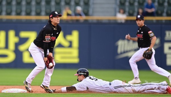 18일 서울 잠실야구장에서 열린 ‘2023 신한은행 SOL KBO리그’ LG 트윈스와 KT 위즈의 경기에서 1회말 2사 1루 상황에서 KT 유격수 김상수가 LG 1루주자 홍창기에게 도루를 허용하고 있다.
