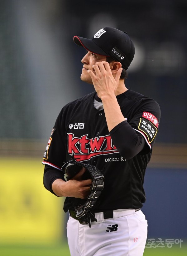 18일 서울 잠실야구장에서 열린 ‘2023 신한은행 SOL KBO리그’ LG 트윈스와 KT 위즈의 경기에서 1회말 동점을 허용한 KT 고영표가 아쉬워하고 있다.
