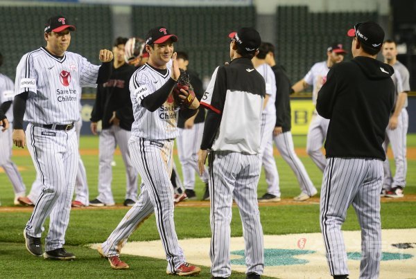18일 서울 잠실야구장에서 열린 ‘2023 신한은행 SOL KBO리그’ LG 트윈스와 KT 위즈의 경기에서 9-5로 승리한 LG 오지환, 김현수가 코치들과 기쁨을 나누고 있다.
